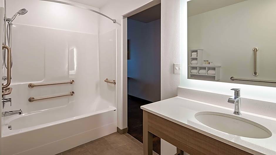 Accessible - Suite King Bed Mobility Accessible Bathtub Queen Sofabed Kitchenette View Non-Smoking F is 431 square feet and includes either a king-size bed 150-183 width or a queen-size bed 150-154 width plus a sofa bed plus desk, satellite tv , cable tv, hairdryer, and tea and coffee making facilities and is Wheelchair-accessible with a Disability-friendly bathroom.